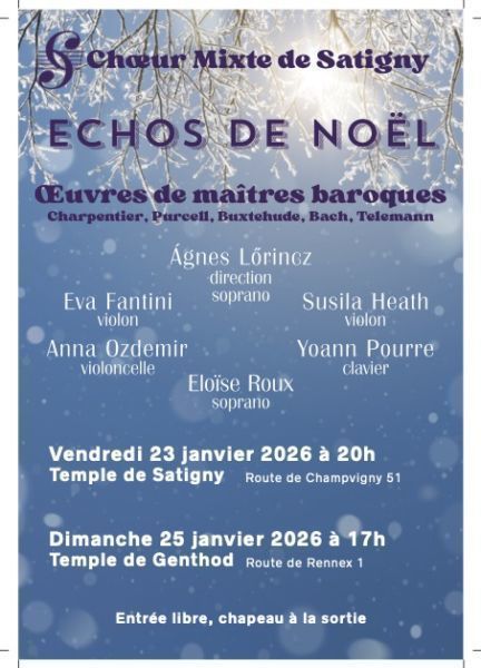 Le Choeur Mixte de Satigny, soutenu par de talentueux musiciens et chanteuses, vous présente des oeuvres des maîtres baroques: Charpentier, Purcell, Buxtehude, Bach et Telemann